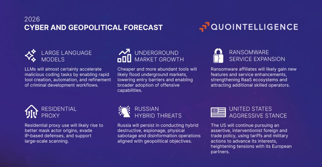 Looking toward 2026, QuoIntelligence assesses the threat environment will almost certainly (95%) remain highly dynamics, with strengthened eCrime ecosystems. Ransomware, infostealers, and residential proxy abuse expanding in scale and sophistication. AI will also remain a core enabler for cybercriminals, particularly in social engineering. At the geopolitical level, state-aligned activities will continue to reflect global tension points, with North Korea intensifying supply chain abuse and workforce infiltration, China pursuing espionage goals, and Russia sustaining hybrid operations. Additionally, we expect the US to maintain an assertive and interventionist foreign and trade policy in 2026, leveraging tariffs and military actions to advance strategic interests, a posture that is already straining relations with European partners.