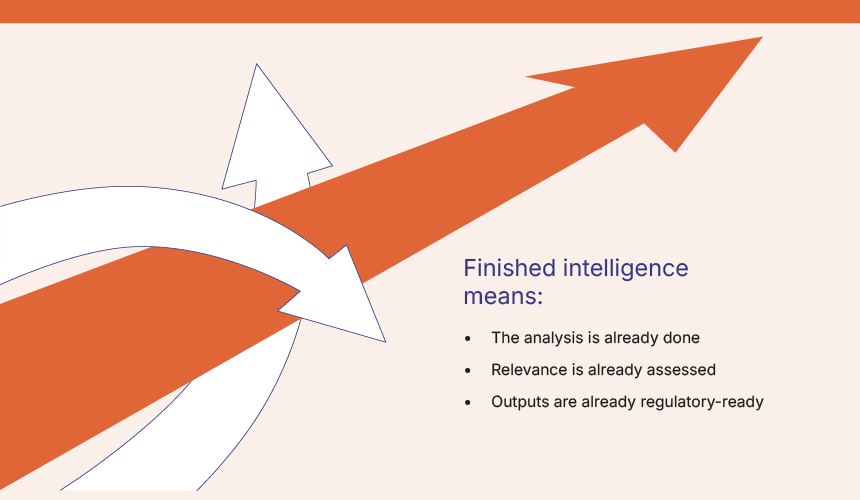 Finished intelligence fundamentally changes this approach by ensuring the analysis has already been completed, the relevance to the organisation has already been assessed, and the outputs are structured from the outset for regulatory and executive use.